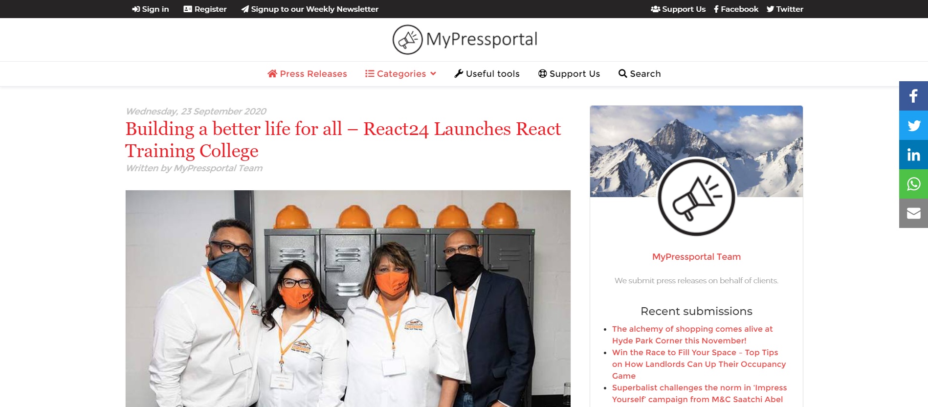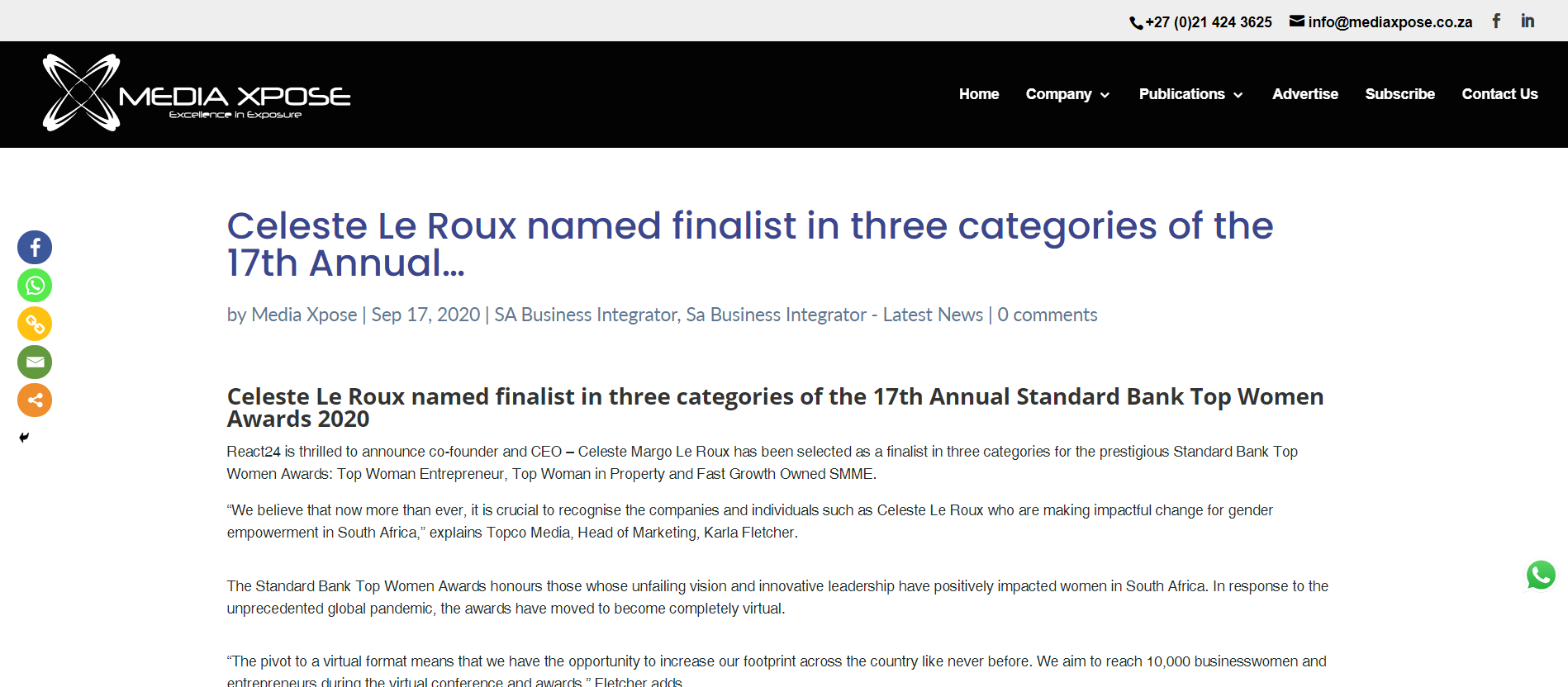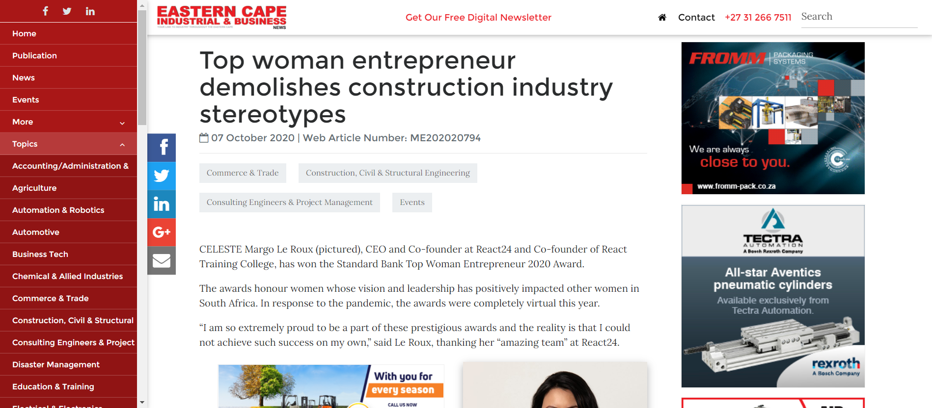 Press Coverage & Media Articles Below are just a few of our featured press and media highlights. Women Champion in Business Award :: Celeste Le Roux :: South African Small Business Awards 2021 Minister Patricia de Lille Visits our React Training College Success at the 2021 ERWIC AWARDS Sunday Independent Newspaper - 11/10/2020 Cape Argus Newspaper - 24/08/2020 Retail Brief Africa (Online Article) - 23/09/2020 Property Wheel (Online Article) - 25/09/2020 IOL Online Article - 07/10/2020 Women On Top - Standard Bank Top Women Awards 2020 - (17/09/2020) Phoenix Sun - Standard Bank Top Women Awards - (19/09/2020) Media Expose - Standard Bank Top Women Awards 2020 - (17/09/2020) BizCommunity - Women On Top - Standard Bank Top Women Awards 2020 - (07/10/2020) B2B Central - Standard Bank Top Women Awards 2020 - (25/09/2020) Eastern Cape Industrial News - Women On Top - Standard Bank Top Women Awards 2020 (07/10/2020) Women On Top - React24 Launches React Training College (23/09/2020) PressPortal - Building a better life for all (23/09/2020) Reward for Women Building a Better Future (31/08/2020)